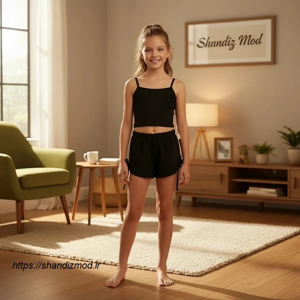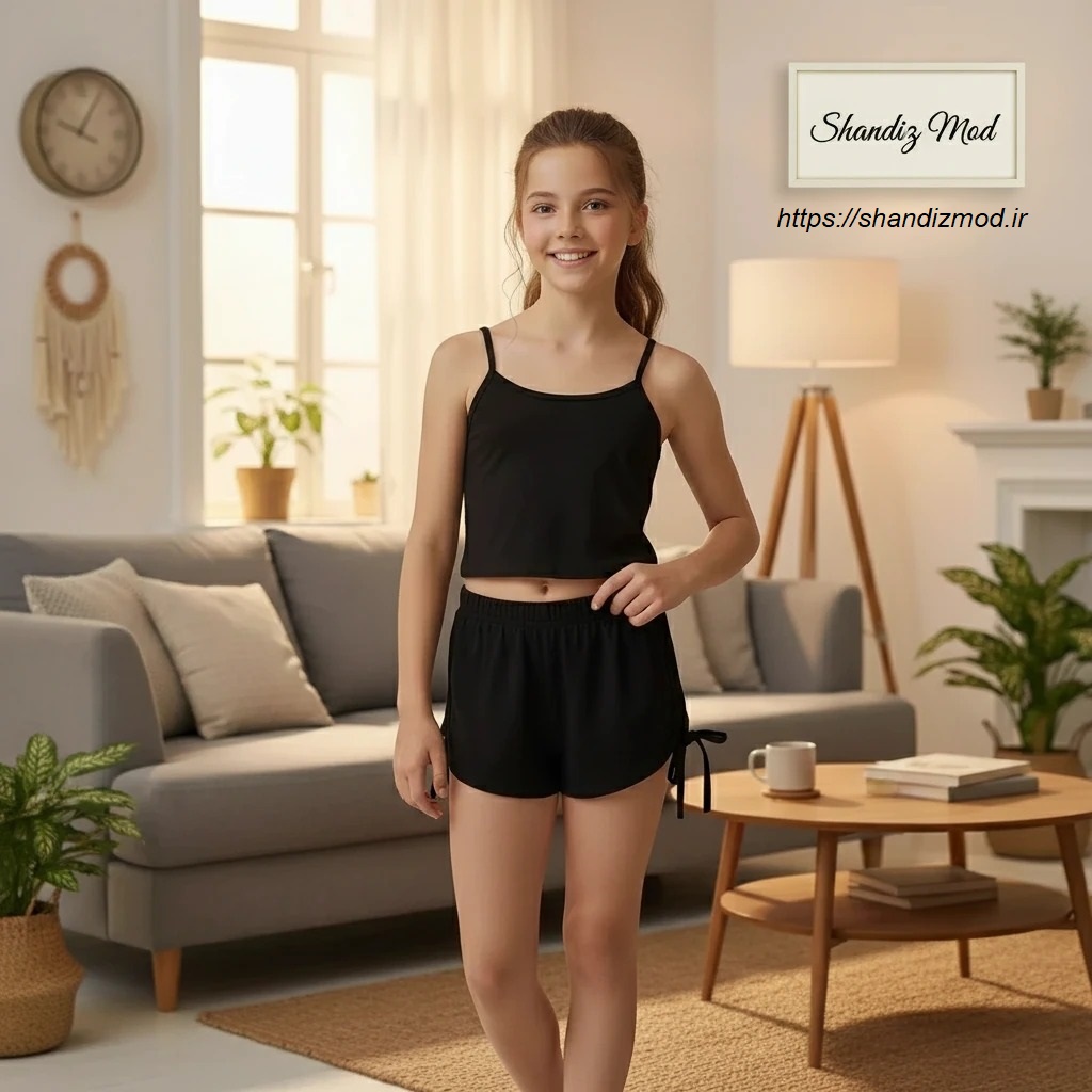 تاپ و شلوارک راحتی دخترانه مدل بندی ظریف رنگ مشکی