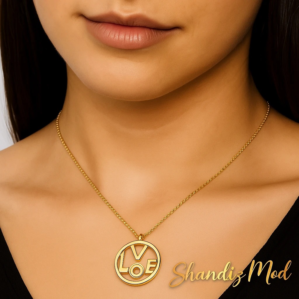 این گردنبند زنانه با طراحی خاص و مینیمال، جلوهای عاشقانه و شیک را به استایل شما میبخشد. پلاک دایرهای این گردنبند از جنس آلیاژ با روکش رنگ طلایی ساخته شده و حروف انگلیسی LOVE درون آن بهصورت برجسته و هندسی طراحی شدهاند.