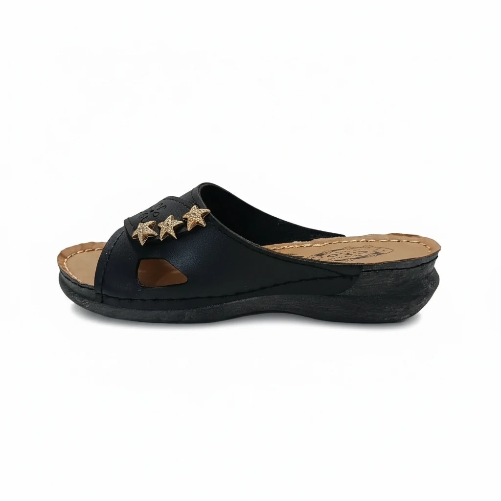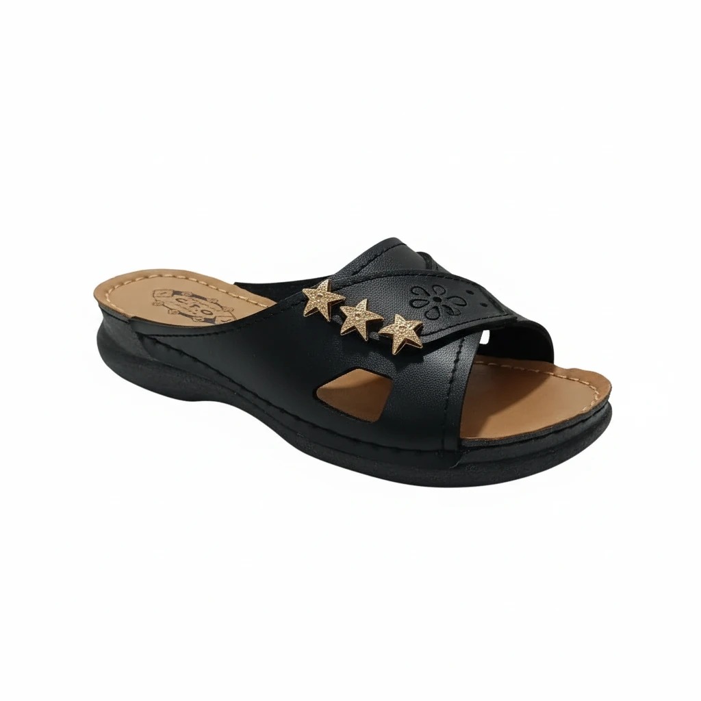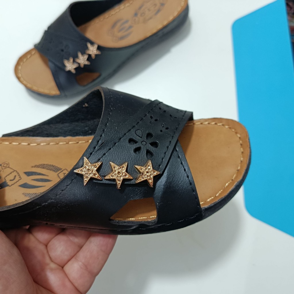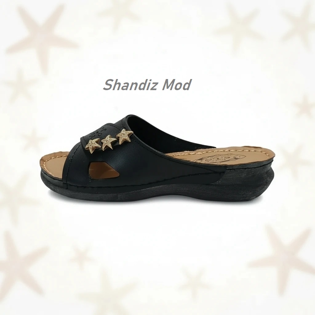این دمپایی زنانه روفرشی/تابستانی با طراحی شیک و در عین حال راحت، انتخابی عالی برای استفاده روزمره در منزل، محل کار یا محیطهای نیمه رسمی است. رویهی صندل از چرم مصنوعی باکیفیت و نرم ساخته شده که علاوه بر دوام مناسب، بهخوبی با فرم پا سازگار میشود و از ایجاد فشار یا خستگی جلوگیری میکند.وجود تزئین فلزی ستارهای ظریف روی رویه، جلوهای خاص به این دمپایی بخشیده و آن را از مدلهای سادهی روزمره متمایز کرده است. طراحی باز در قسمت جلو و کنارهها باعث گردش بهتر هوا شده و گزینهای مناسب برای فصول گرم سال محسوب میشود.