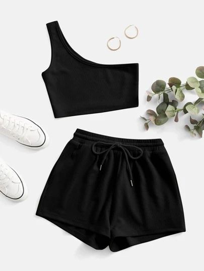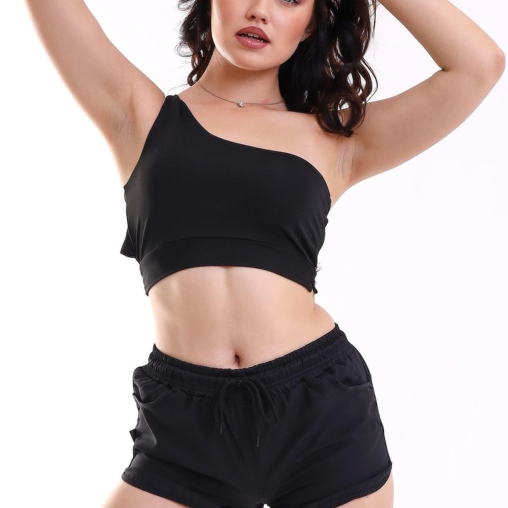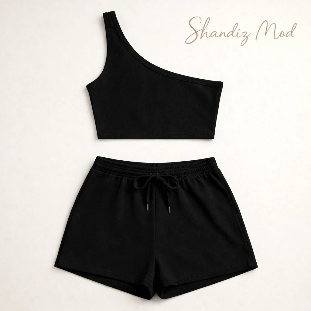 ست تاپ و شلوارک زنانه یقه رومی (One-Shoulder) مدل بنددار – مشکی